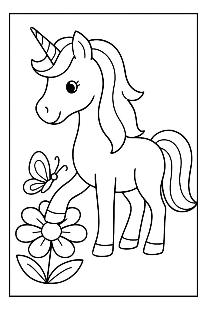 Diese Version kombiniert gleich mehrere Lieblingselemente: Das Einhorn wird von flatternden Schmetterlingen und duftenden Blumen umgeben. Dieses Motiv ist ideal für Kinder, die gerne intensive Farben verwenden und Bewegung im Bild darstellen möchten.