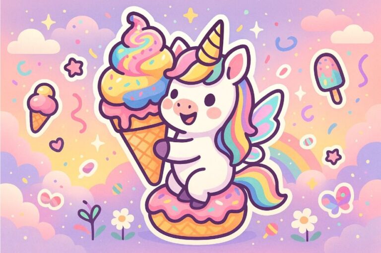 Ob als Regenbogen-Eis, fliegendes Einhorn oder magischer Eiswagen – die Möglichkeiten sind endlos. Alles, was du brauchst, sind ein paar Stifte, Fantasie und gute Laune.