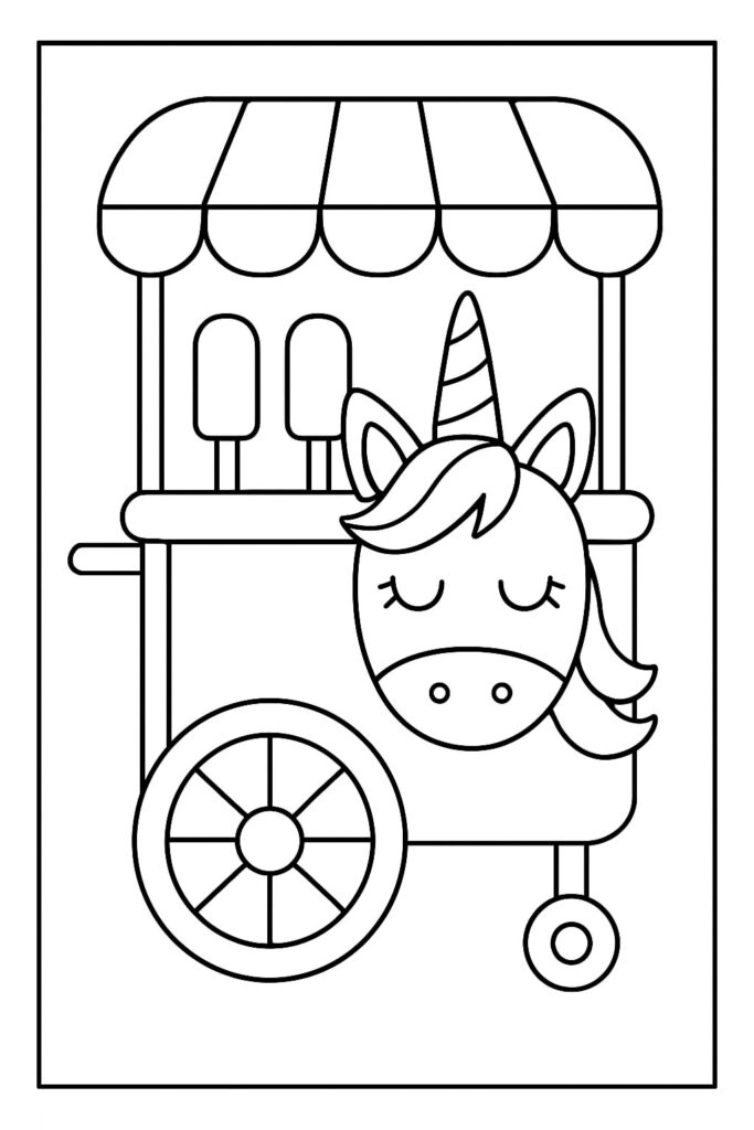 Ein besonderes Highlight: Das Einhorn verkauft Eis aus einem kleinen bunten Wagen. Diese Variante hat viele Details und eignet sich für Kinder, die gerne länger an einem Bild arbeiten.