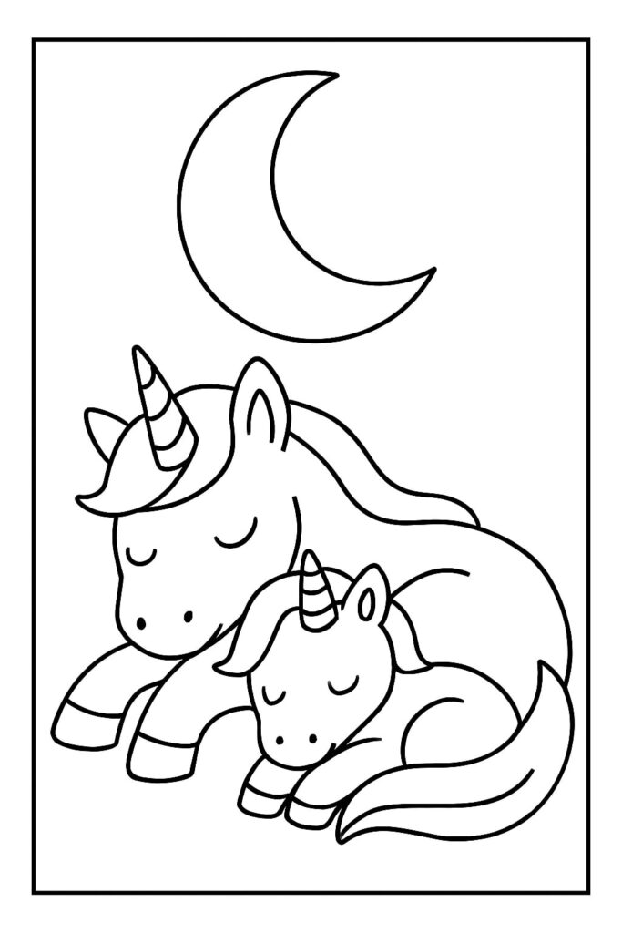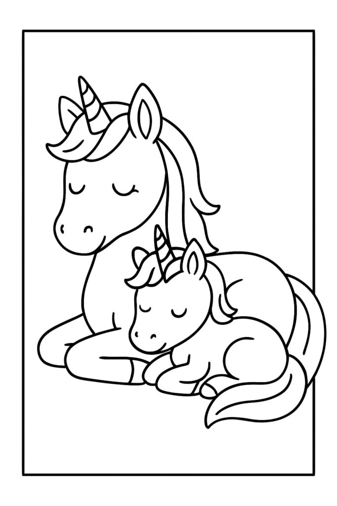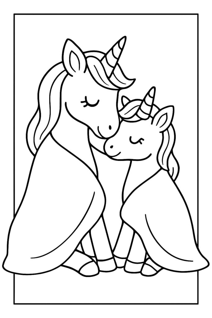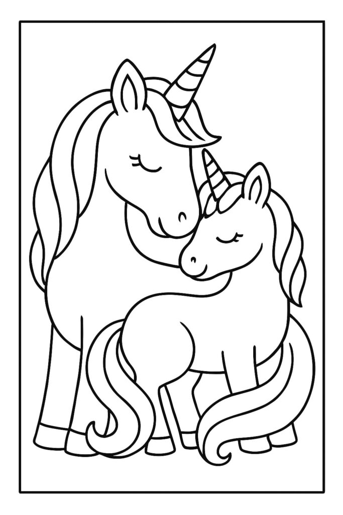 Ein beruhigendes einhorn familie ausmalbild zeigt eine Einhornmutter mit ihrem Fohlen, das sich an sie kuschelt. Solche Motive eignen sich hervorragend für ruhige Malstunden am Abend oder in Kindergärten zur Entspannung.