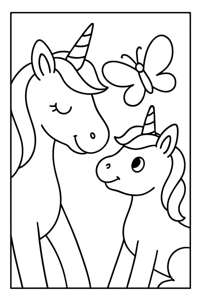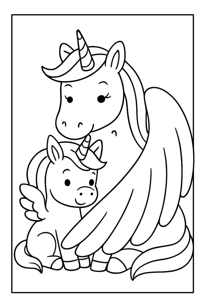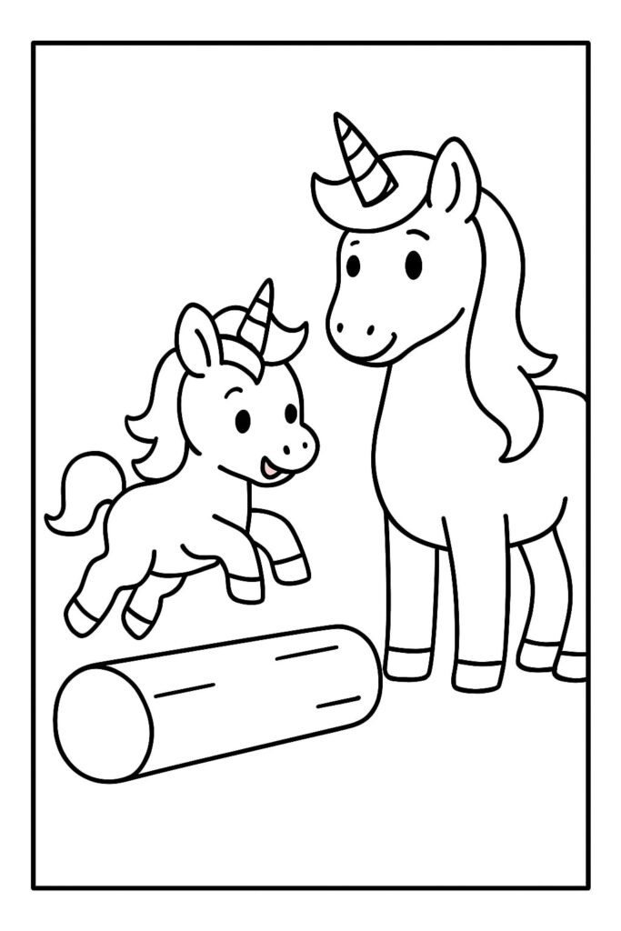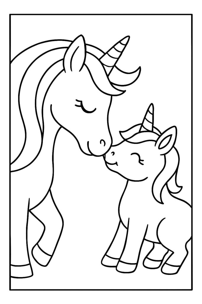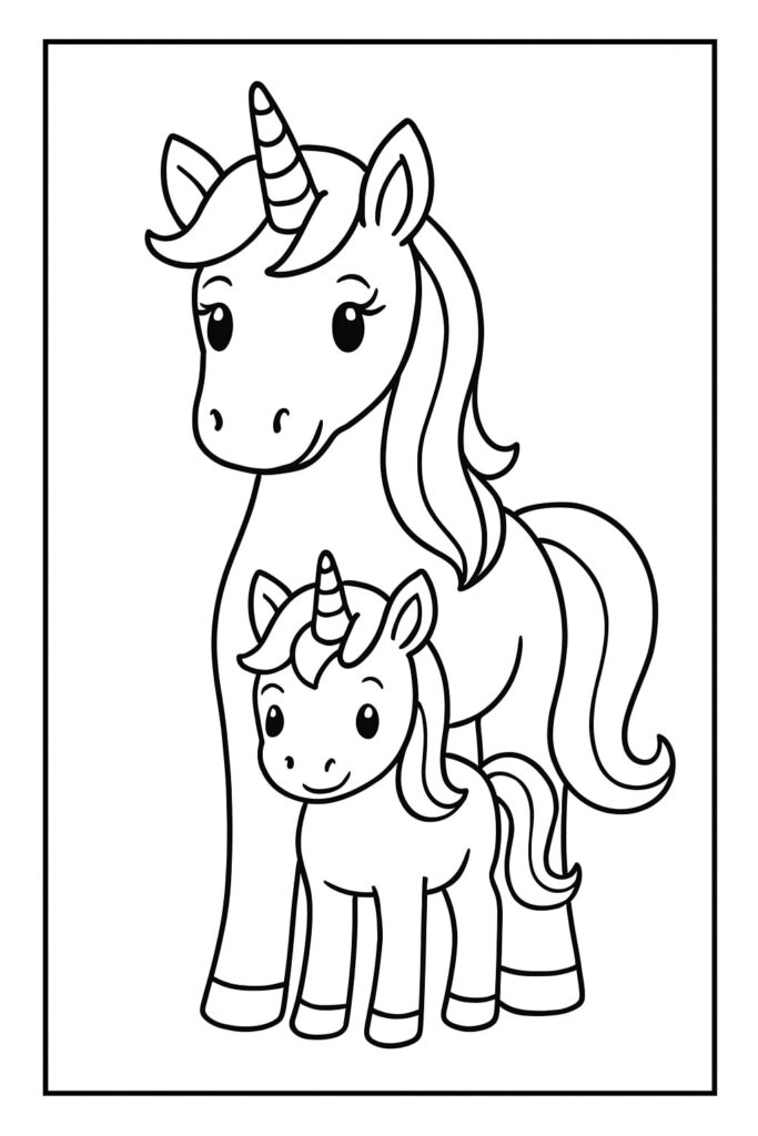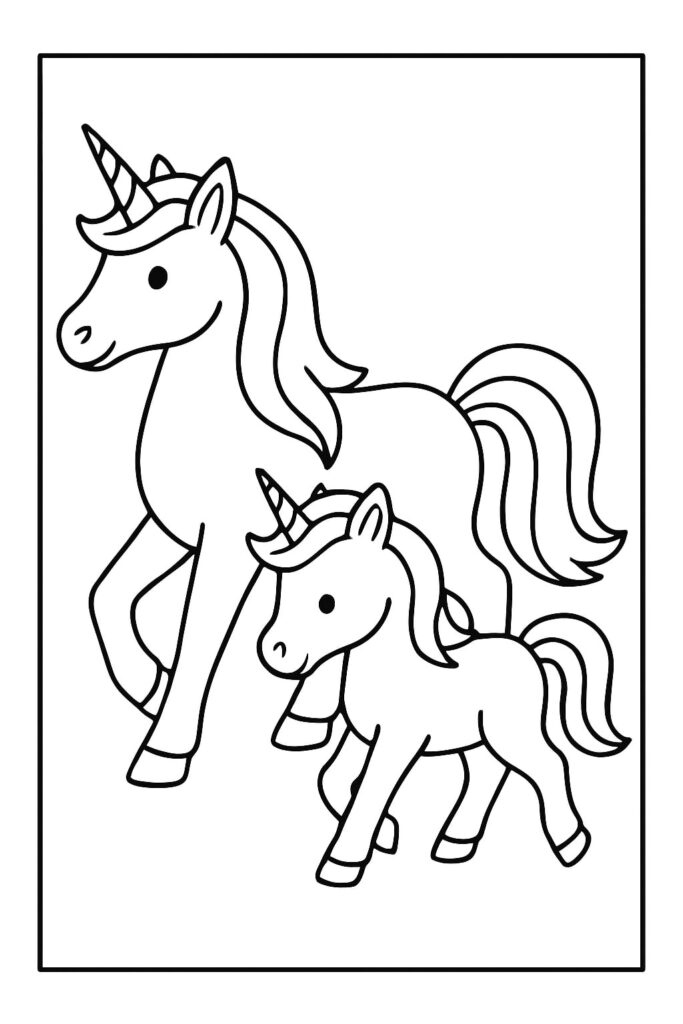Ein klassisches ausmalbild einhorn familie zeigt ein großes Einhorn mit einem Fohlen, das an seiner Seite steht. Große Flächen und klare Linien machen es leicht auszumalen – ideal für Kinder ab 3 Jahren.