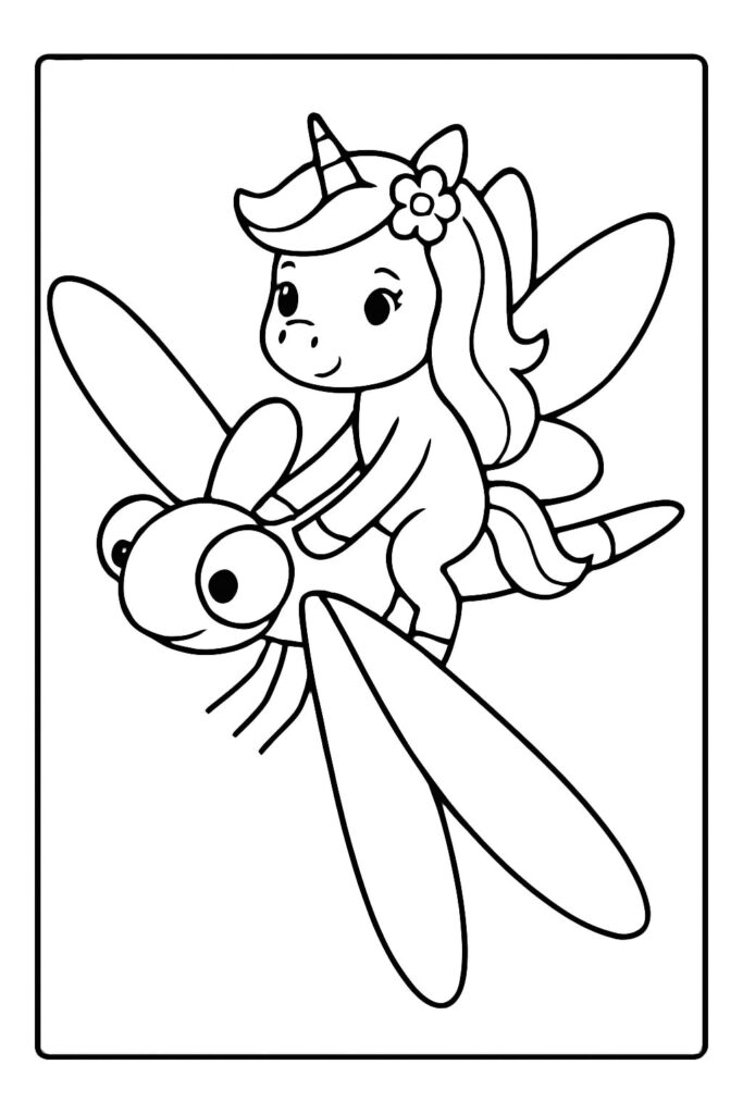 - Mittlere Schwierigkeit für Schulkinder: Ausmalbild einhorn mit fee mit Blumen, Sternen oder kleinen Tieren im Hintergrund.