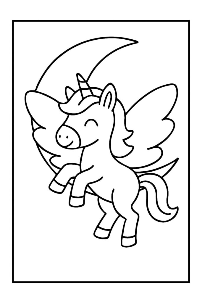 - Einfach und klar für Vorschulkinder: Große Flächen, wenig Details, ein fröhliches Einhorn mit einer lächelnden Fee daneben.