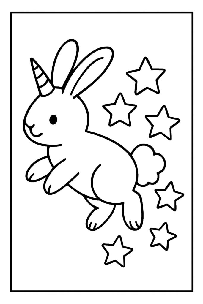 Ein romantisches einhorn hase ausmalbild zeigt die beiden Freunde nachts unter einem funkelnden Sternenhimmel. Kinder können hier mit dunklen Blautönen, Glitzer und Metallic-Stiften experimentieren – perfekt, um das Thema „Magie der Nacht“ umzusetzen.