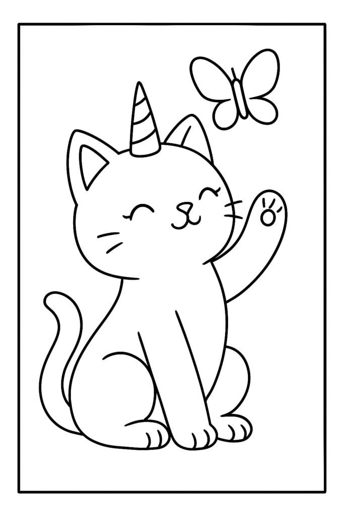 Dieses einhorn kätzchen ausmalbild ist voller Lebensfreude. Das Kätzchen sitzt oder spielt unter einem bunten Regenbogen, manchmal mit kleinen Schmetterlingen oder Blumen um sich herum. Hier können Kinder kräftige und leuchtende Farben einsetzen.