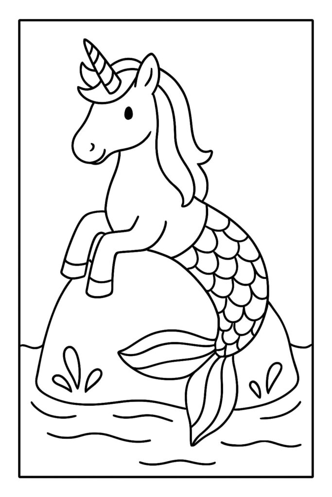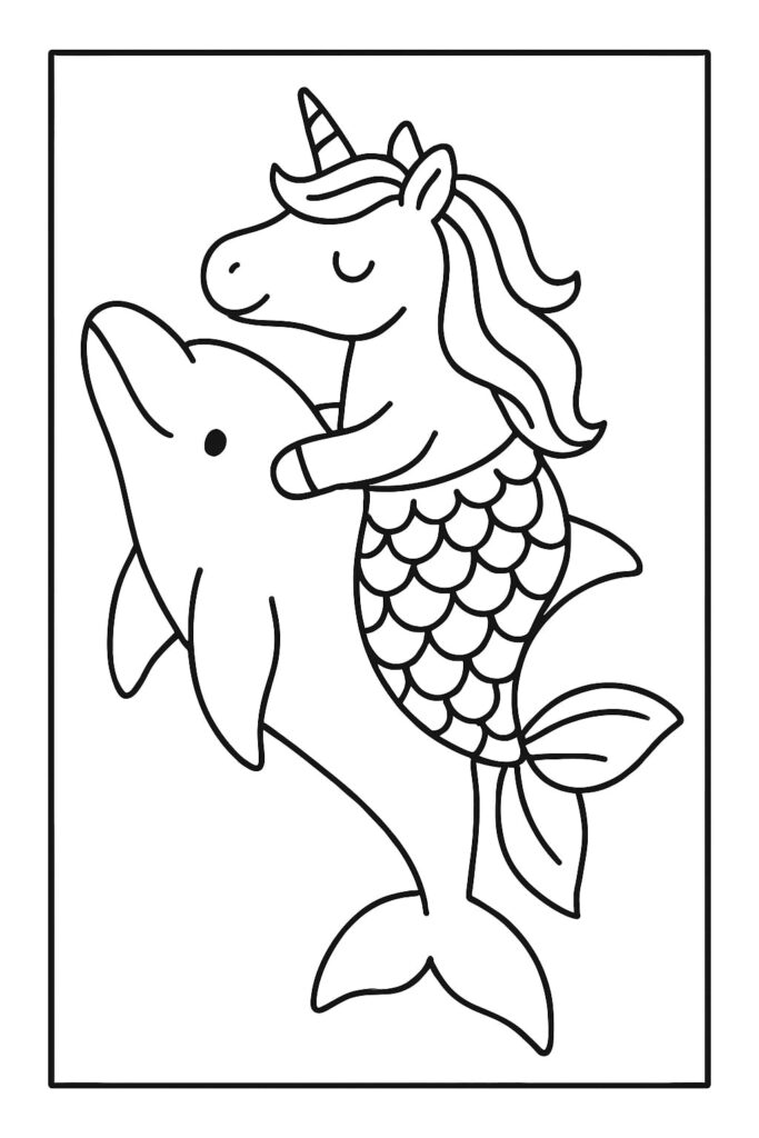 - Großflächige Figuren mit klaren Konturen: ein ausmalbild einhorn mit flosse, das neben einer lächelnden Meerjungfrau schwimmt.
