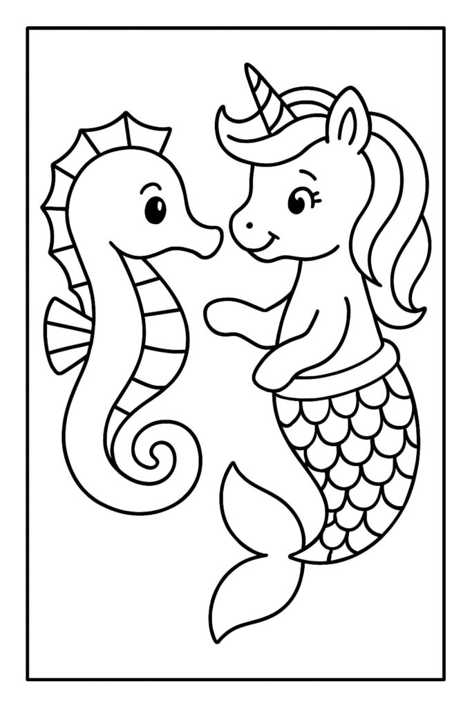 Ein seepferdchen einhorn ausmalbild macht als Nebenfigur Spaß; auch Krabben oder Rochen erweitern die Szene.