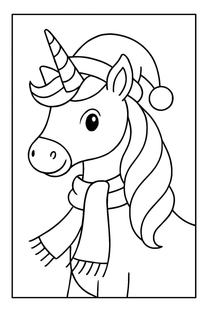 Das klassische einhorn mit weihnachtsmütze ausmalbild zeigt das Tier fröhlich im Schnee, mit einer roten Mütze und manchmal einem Schal. Ideal für kleine Kinder, da es klare Linien und große Flächen bietet.