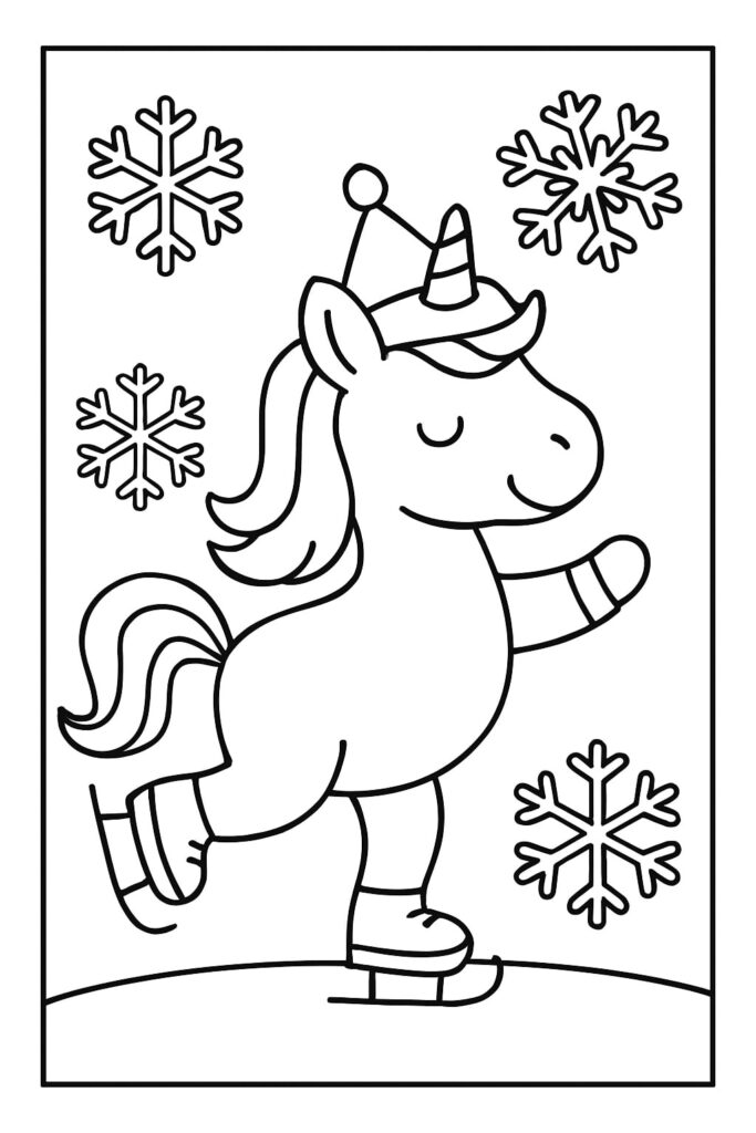 Ein fröhliches Einhorn spielt mit winterlichen Begleitern wie Pinguinen, Schneemännern oder Eulen. Dieses ausmalbild winter einhorn bietet Raum für fantasievolle Farbkombinationen und Geschichten, die Kinder während des Malens erfinden können.